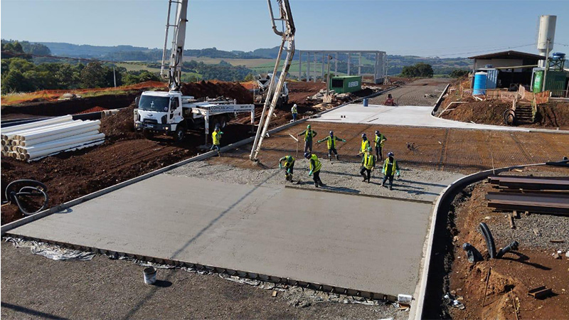 Piso de Fibra Sintética estrutural (h = 12, 14 e 15 cm) Equipamentos utilizados: Laser Screed, Spreader e Acabadoras duplas Fazenda Rio Grande-PR